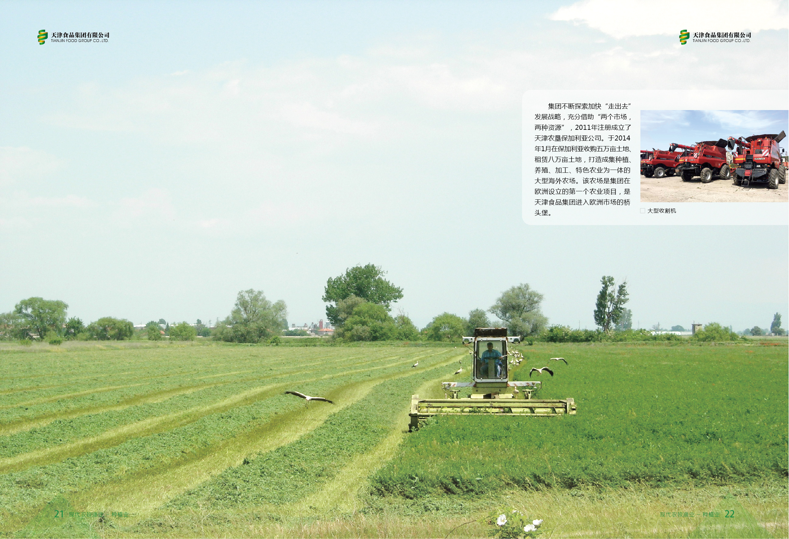 集團不斷探索加快“走出去”發(fā)展戰(zhàn)略,充分借助“兩個市場,兩種資源”,于2011年成立天津農墾龍呈嘉益國際貿易有限公司,在保加利亞收購、租賃土地,打造成集種植、養(yǎng)殖、加工、特色農業(yè)為一體的大型海外農場。該農場是集團在歐洲設立的第一個農業(yè)項目,是天津食品集團進入歐洲市場的橋頭堡。The Group quickens its pace to implement the “going global” development strategy, and fully leverages the “two markets, two resources” advantage. In 2011, Tianjin Agriculture Reclamation Longcheng Jiayi International Trade Co., Ltd. was established. The company acquires and leases land in Bulgaria, and builds a large overseas farm that combines planting, breeding, processing and characteristic agriculture. The farm is the first agricultural project the Group launched in Europe, and is also the “bridgehead” for Tianjin Food Group to enter the European market.